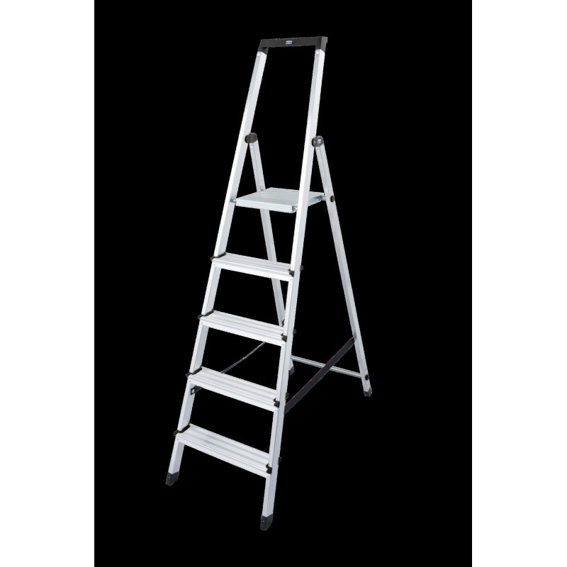 Односторонняя алюминиевая стремянка c высокой дугой безопасности, с большой противоскользящей площадкой. Прочные боковины подъемной и опорной частей из алюминиевой прямоугольной трубы. Практичный крюк для ведра с плошкой для мелких деталей. Профилированные ступеньки шириной 80 мм для безопасного подъема и удобного положения при работе. Многократное прочное заклепочное соединение ступенек с боковинами. Противоскользящие опорные наконечники обеспечивают устойчивое положение.