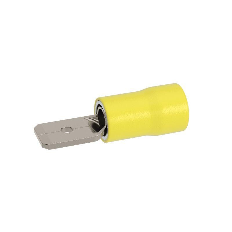 Предназначен для оконцевания медных/алюминиевых многопроволочных жил кабелей/проводов в электрических цепях переменного/постоянного тока напряжением до 600 В. Контактная часть выполнена из высококачественной меди марки М1. Лужение исключает образование гальванической пары. Внутренняя часть гильзы имеет радиальные насечки, повышающие плотность контакта. Изоляция из ПВХ выдерживает температуру до 85 ?C. Класс горючести - V0, стандарт UL 94. Полностью изолированные - нет. Двойная гильза обеспечивает наилучший электрический контакт и повышает виброустойчивость соединения. Рекомендованы для регионов с повышенной сейсмической активностью и на производственных объектах. Цвет - желтый. Сечение: 4–6 кв.мм. Размер клеммы 6,3?0,8 мм. Длина лопатки - 9 мм. Форма контактной части - "папа".