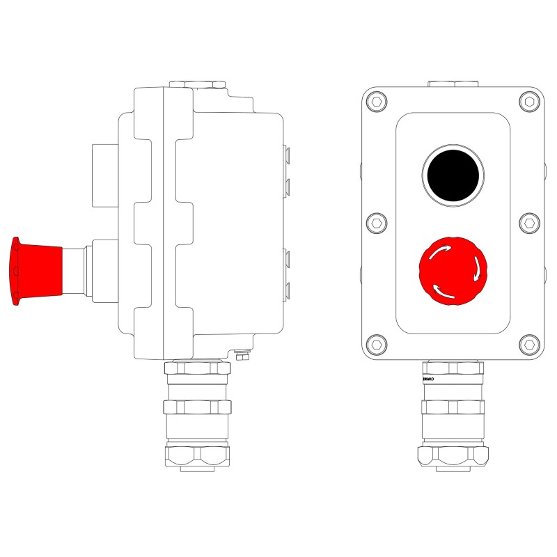 Взрывонепроницаемый пост управления из алюминия LCSD-02-B-MB-P1B(11)x1-P6R(11)x1-PBMB-KAEPM2MHK-20 Взрывозащищенный местный пост управления из алюминия на 2 эл.управления. Маркировка: 1Ex d IIB T5 Gb / Ex tb IIIC T95°C Db / IP66 Температура окружающей среды: От -60°C до +40°C Элементы управления P1 – кнопка без фиксации. Цвет черный - 1шт. P6 – кнопка грибовидная с фиксацией, отпускание поворотом (размер O40 мм). Цвет красный - 1шт. Кабельные вводы Снизу: Взрывозащищенный кабельный ввод серии КАЕРМ для бронированного и небронированного кабеля в металлорукаве COSMEC Dn:20 М20х1,5 d:5,8-12мм.Никелированнаялатунь IP66/IP68 Сверху: Взрывозащищенная заглушка Ex d e, М20x1,5. Никелированная латунь. IP66/67/68