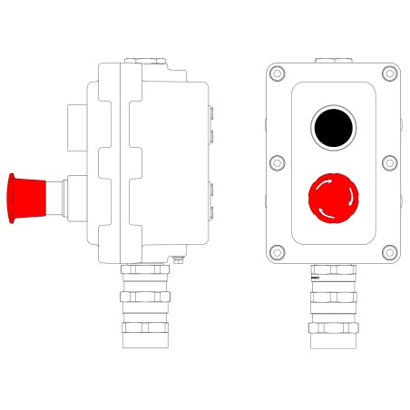 Взрывонепроницаемый пост управления из алюминия LCSD-02-B-MC-P1B(11)x1-P6R(11)x1-PCMB-KA3MHK Взрывозащищенный местный пост управления из алюминия на 2 эл.управления. Маркировка: 1Ex d IIB T5 Gb / Ex tb IIIC T95°C Db / IP66 Температура окружающей среды: От -60°C до +40°C Элементы управления P1 – кнопка без фиксации. Цвет черный - 1шт. P6 – кнопка грибовидная с фиксацией, отпускание поворотом (размер O40 мм). Цвет красный - 1шт. Кабельные вводы Снизу: Взрывозащищенный кабельный ввод серии КА для бронированного кабеля М25х1,5 d:11,8-18мм D:15-25мм. Никелированная латунь IP66/IP68 Сверху: Взрывозащищенная заглушка Ex d e, М25x1,5. Никелированная латунь. IP66/67/68
