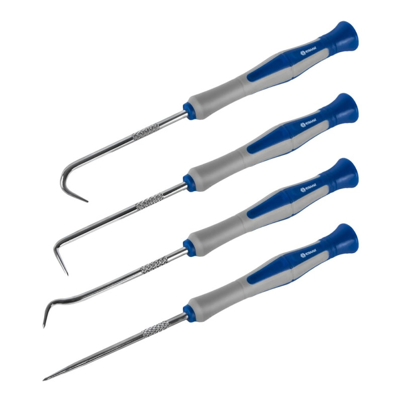Набор крючков для слесарных работ CR-V 4шт КОБАЛЬТ 245-480 широко используется в автомобильных и слесарных мастерских для проведения разметочных работ с применением металлических и других типов деталей, прокалывания отверстий в разнообразных материалах, демонтажа сальников и уплотнительных колец. Инструменты состоят из прочных рабочих частей, выполненных из хром-ванадиевой стали с твердостью 51-54 HRC, а также эргономичных рукояток из двухкомпонентного материала с противоскользящими свойствами.