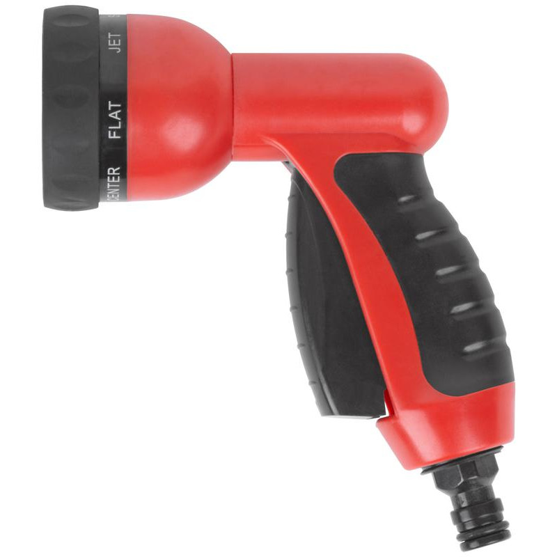 7 режимов распыления. Однократное нажатие на курок фиксирует режим непрерывной подачи воды, повторное нажатие на курок прекращает подачу воды. Универсальное быстросъемное соединение. Материал: пластиковый прорезиненный регулятор режимов, пластиковые курок и накладка на ручку, корпус из ударопрочного ABS пластика. Упаковка: картонный подвес.
