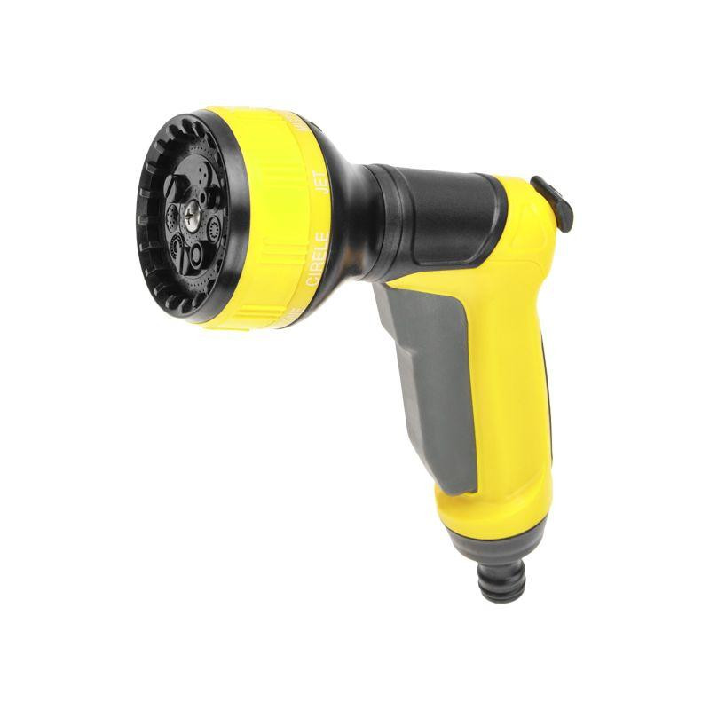Пистолет оснащен эргономичной прорезиненной ручкой, благодаря которой его удобно и комфортно держать в руке даже на протяжении длительного времени. Имеет 7 режимов подачи воды, регулируемых поворотной головкой.