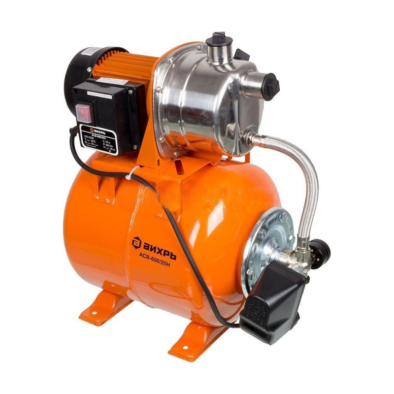 Автономная станция водоснабжения Вихрь АСВ-600/20Н оборудована двигателем мощностью 600 Вт. Он обеспечивает пропускную способность до 55 л/мин. Перемещает жидкость на расстояние 35 м. Глубина всасывания воды достигает 9 м. Реле защищает мотор от сухого хода. Встроенный манометр позволяет контролировать давление в системе. Гидроаккумуляторный бак объемом 20 л предназначен для поддержания необходимого уровня воды, автоматического запуска и отключения насоса. Встроенный эжектор придает ускорение потоку жидкости и обеспечивает самовсасывание на глубине.Модель Вихрь АСВ-600/20Н может обеспечивать снабжение водой до трех открытых водозаборных точек, при заборе с глубины до 5м и при длине магистрали до 5м. При заборе с глубины до 6м и при длине магистрали до 5м водоснабжение будет обеспечено для двух открытых водозаборных точек.Автономная станция водоснабжения поверхностного типа Вихрь АСВ-600/20Н применяется для постоянной подачи чистой воды в загородных домах и на дачных участках, где отсутствует центральное водоснабжение. Обеспечивает бытовые нужды и полив. Корпус и помпа насоса выполнены из нержавеющей стали. Она устойчива к образованию коррозии и отличается длительным сроком службы. Класс защиты IP44 позволяет размещать агрегат в помещениях с повышенной влажностью, защищает внутренние узлы от попадания пыли. Диаметр входного и выходного отверстия G1 дюйм позволяет монтировать стандартный трубопровод. Центробежная конструкция обеспечивает низкий уровень шума во время работы.