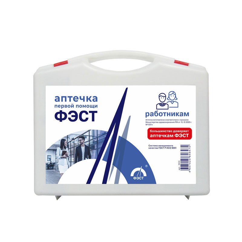Аптечка первой медицинской помощи работникам ФЭСТ выпускается производителем в четырех исполнениях: в пластиковом чемоданчике, пластиковом и металлическом шкафчике, в сумке.