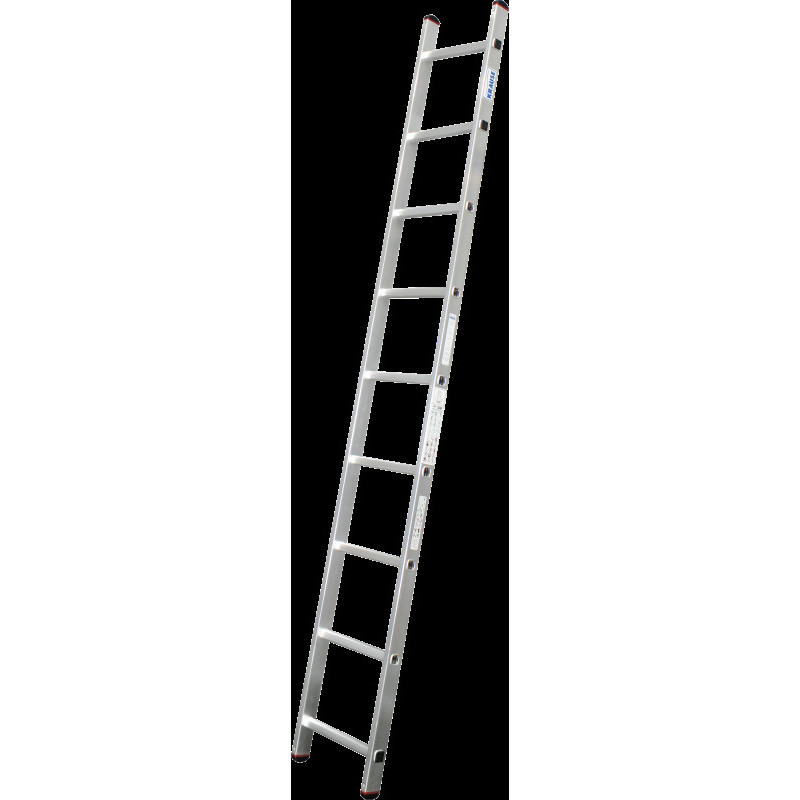 Легкая односекционная приставная лестница. Нескользящие, полностью профилированные перекладины со всех сторон. Нескользящие опорные заглушки боковин сверху и снизу. Легкий вес. До 150 кг нагрузки. Продукт сертифицирован в строгом соответствии с ГОСТ Р 58752-2019 и DIN EN-131.