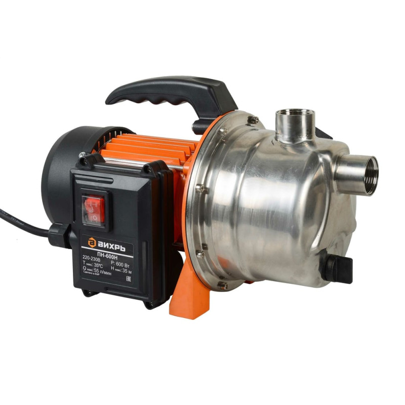 Вихрь ПН-600 относится к категории мощных поверхностных насосов. Электронасос представляет собой часть насосной станции и выполняет функцию поддержки оптимального уровня давления. Центробежный насос предназначен для орошения садового участка, огорода. Эффективное всасывание с максимальной глубины не более 9 м. Снабжен эжектром для самовсасывания с глубины.Корпус выполнен из нержавеющей стали. Модель снабжена однофазным, асинхронным электродвигателем с короткозамкнутым ротором с мощностью 600 Вт. Эти параметры позволяют добиться максимальной подачи воды 55 л/мин. Работает от сети со стандартным напряжением, автоматически отключается при скачках для обеспечения безопасности. Двигатель поверхностного насоса рассчитан на 20 включений в час.Важно, чтобы концентрация твердых частиц в перекачиваемой воде не превышала 150 г на м³. Для дополнительной устойчивости предусмотрены крепления. Перед установкой и эксплуатацией Вихрь ПН-600Н настоятельно рекомендуем ознакомиться с инструкцией пользователя.