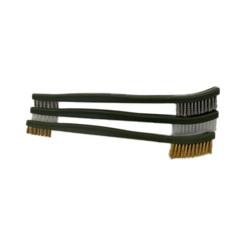 Детейлинговая двухсторонняя щетка AMR набор 3 шт. A1001BRSH применяется при зачистке шин, очистки элементов подвески и т.д. В наборе три кисти для детейлинга: две щётки с латунной (жёсткие) и одна с нейлоновой щетиной (средней жёсткости). Удобная ручка. Дополнительные характеристики: Длина щетины до 2 см; Длина щетки 18 см.
