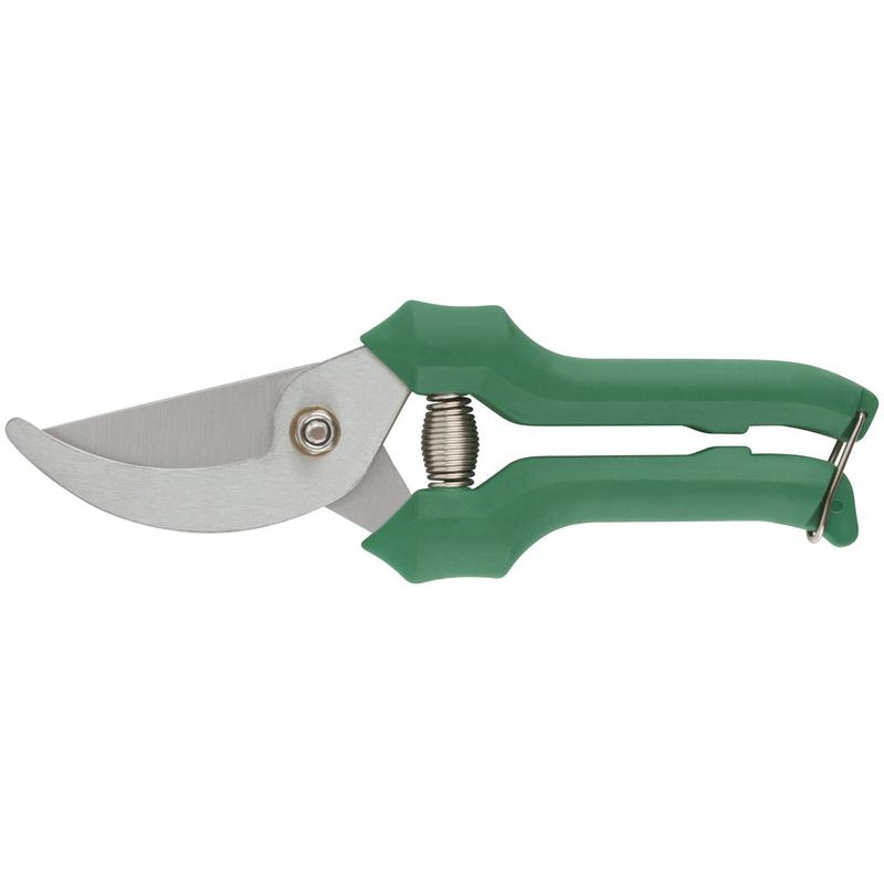 Секатор. С проволочной пружиной и скобойфиксатором. Режущие кромки внахлест. Для обрезания побегов и веток толщиной до 20 мм. Материал: лезвия из инструментальной стали, пластиковые ручки. Упаковка: блистер.