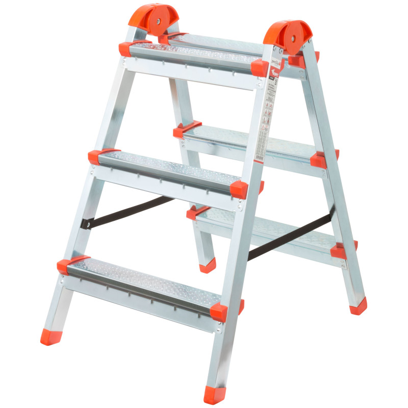 Лестница-стремянка КУРС отличается прочной стальной конструкцией высокой устойчивости с надёжными фиксаторами и ремнями. Широкие ступени обеспечивают комфортное положение ног и не вызывают усталость при длительном нахождении на лестнице. Компактный размер в сложенном состоянии обеспечивает удобство хранения и транспортировки. Между собой две стороны стремянки соединены шарнирами из прочного ABS-пластика, обеспечивающими легкое складывание и раскладывание изделия.