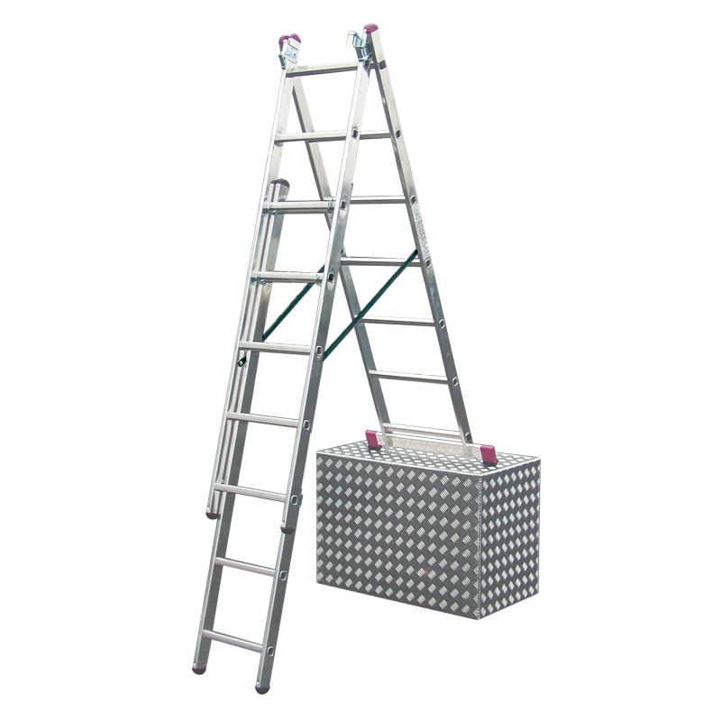 Алюминиевая трехсекционная лестница с перекладинами, универсального применения, используется как приставная, выдвижная или как стремянка. Прочный стальной направляющий профиль обеспечивает удобное выдвижение лестницы. Профилированные перекладины для безопасного подъема и спуска. Широкая поперечная траверса с двухкомпонентными заглушками увеличивает опорную площадь. Противоскользящие двухкомпонентные опорные заглушки - твердый материал обеспечивает прочное соединение с боковиной, мягкий материал обеспечивает надежное сцепление с поверхностью и препятствует скольжению лестницы. Самофиксирующиеся крюки-защелки препятствуют произвольному выскальзыванию секций при работе и транспортировке. Устойчивые к атмосферным воздействиям ремни препятствуют нежелательному раздвижению лестниц в рабочем положении. Лестницы снабжены дополнительными фиксатороми, позволяющими установку на лестничном марше.