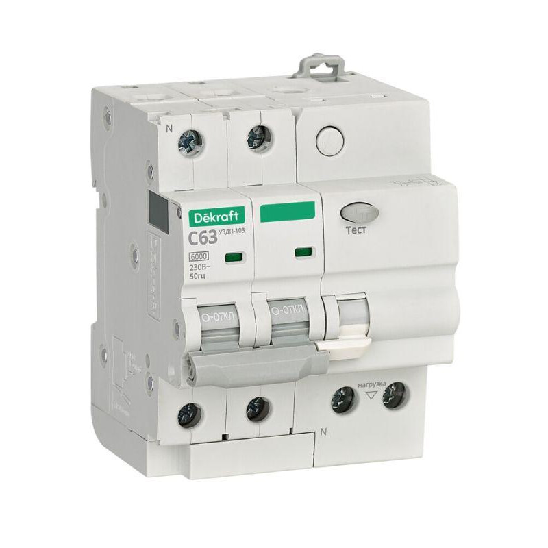 Устройство защиты от дугового пробоя серии УЗДП-103 Dekraft; 2P; номинальный ток 63 А; отключающая способность 6кА. УЗДП-103 сочетает функции УЗДП и автоматического выключателя, обеспечивает три вида защиты — от короткого замыкания, перегрузки и дугового пробоя. Устройства защиты от дугового пробоя серии УЗДП-103 применяются в однофазных сетях. УЗДП могут применяться для защиты групповых сетей или отдельных линий в зависимости от количества приборов потребления и общей пожароопасности помещения. Применение УЗДП регламентировано нормативными документами СП 256.1325800.2016, ГОСТ IEC 61009-1-2014 и ГОСТ 31216-2003.