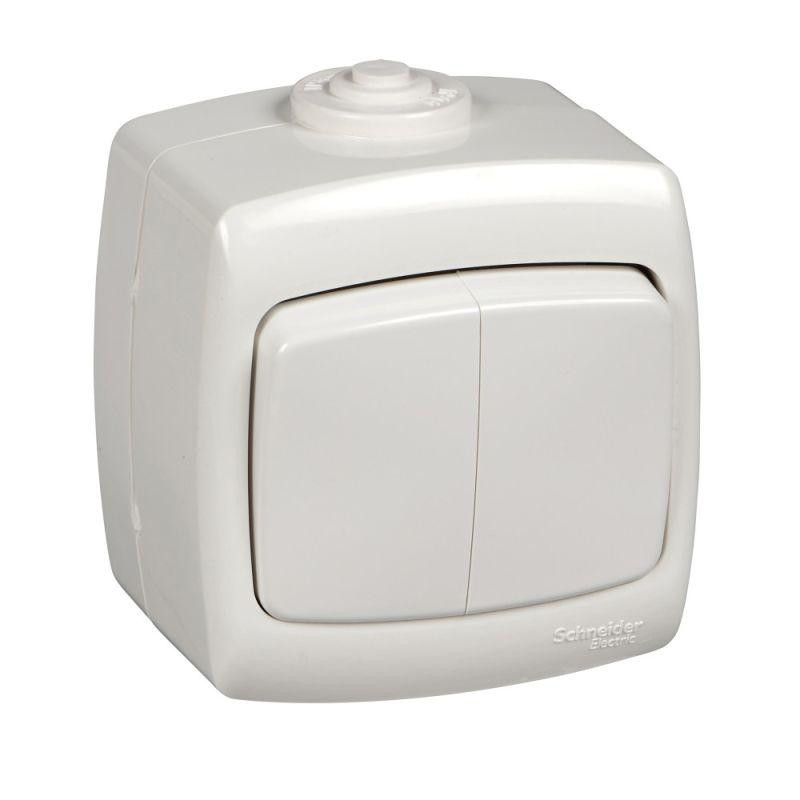 Выключатель двухклавишный Schneider Electric РОНДО (открытой установки, цвет белый) предназначен для сетей до 250 В, на ток до 6 А.
